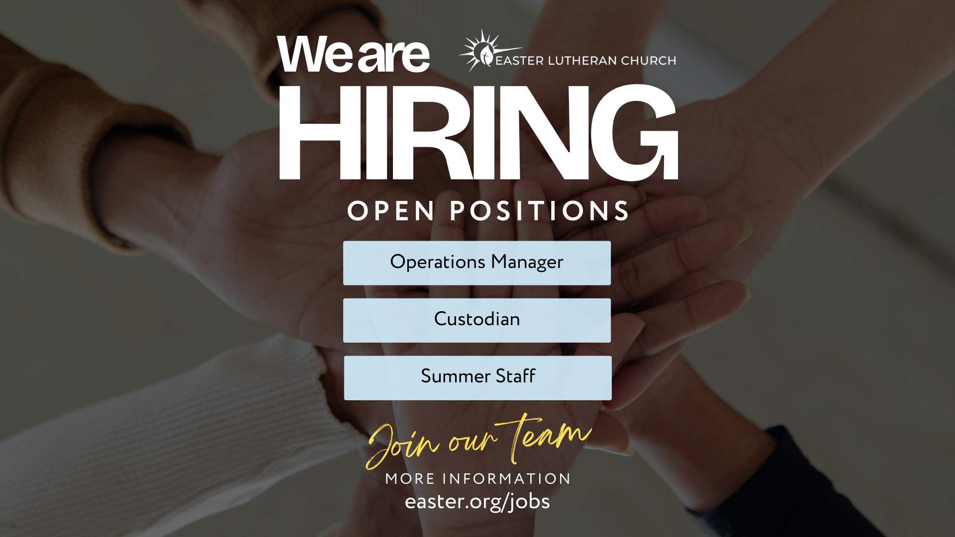 On Easter, the church celebrates that Jesus defeated death, sin, and all evil through his resurrection. Whether you associate the holiday of Easter with the holiest day of the Christian year or a day filled with candy and family traditions, it means something special and exciting. Our congregation welcomes you into a life of holiness, celebration, fun, and sharing in the good news of Jesus, no matter who you are or what you know about the meaning of Easter Sunday. Also, we don’t know of any other church named Easter, so we hope it helps you remember who we are and what Jesus is about!