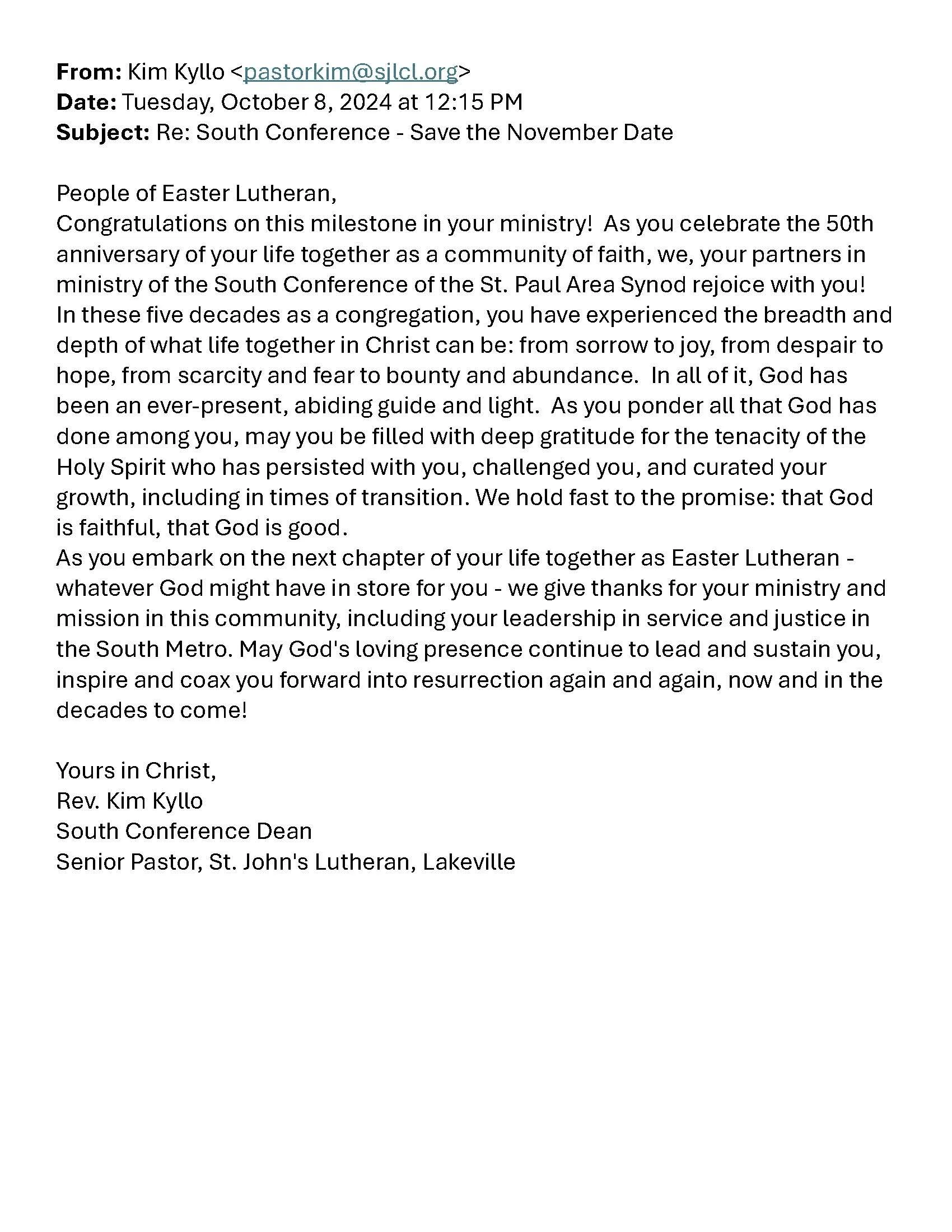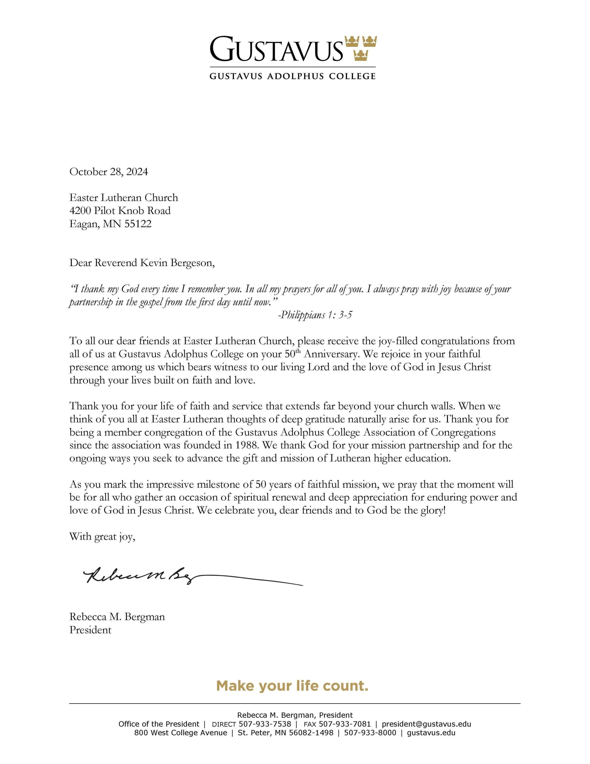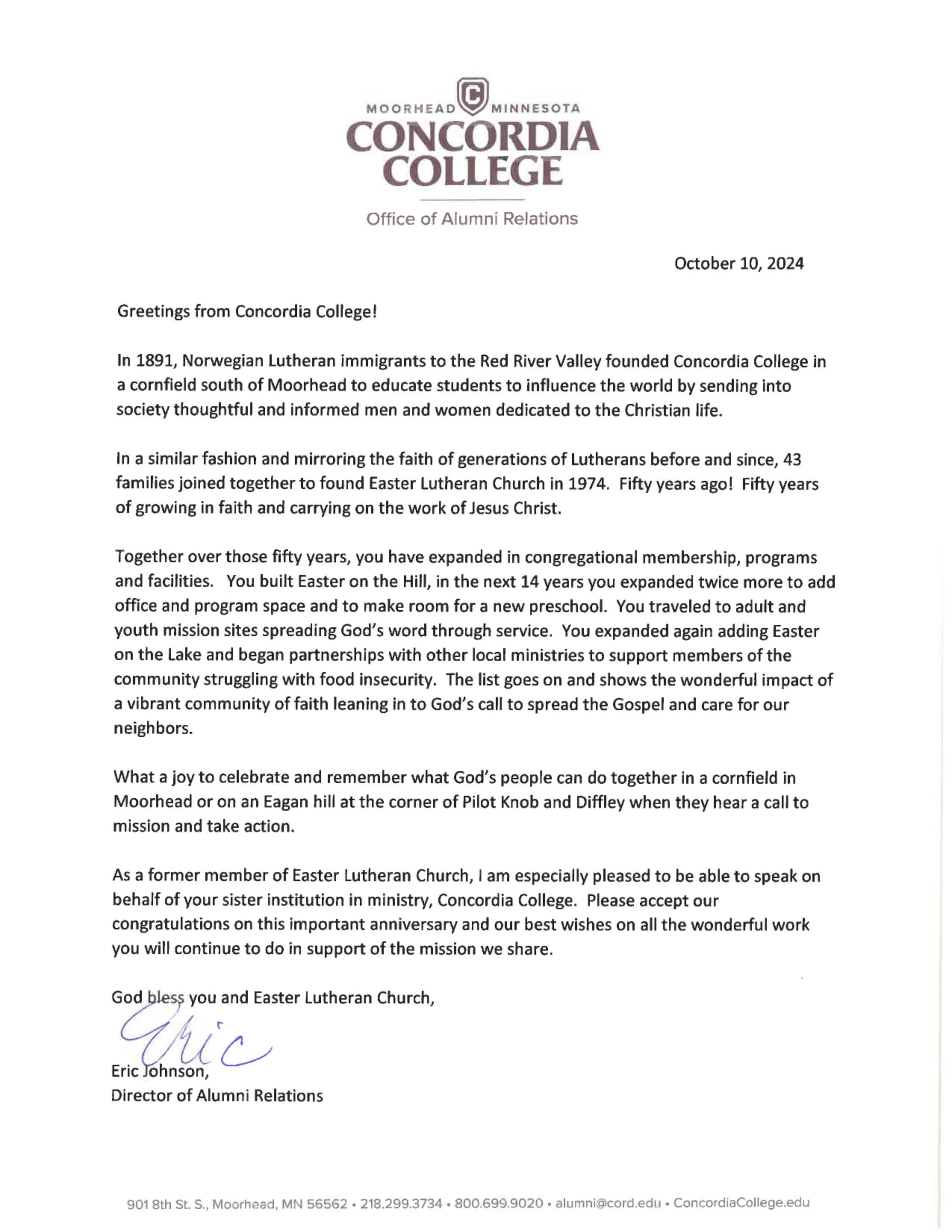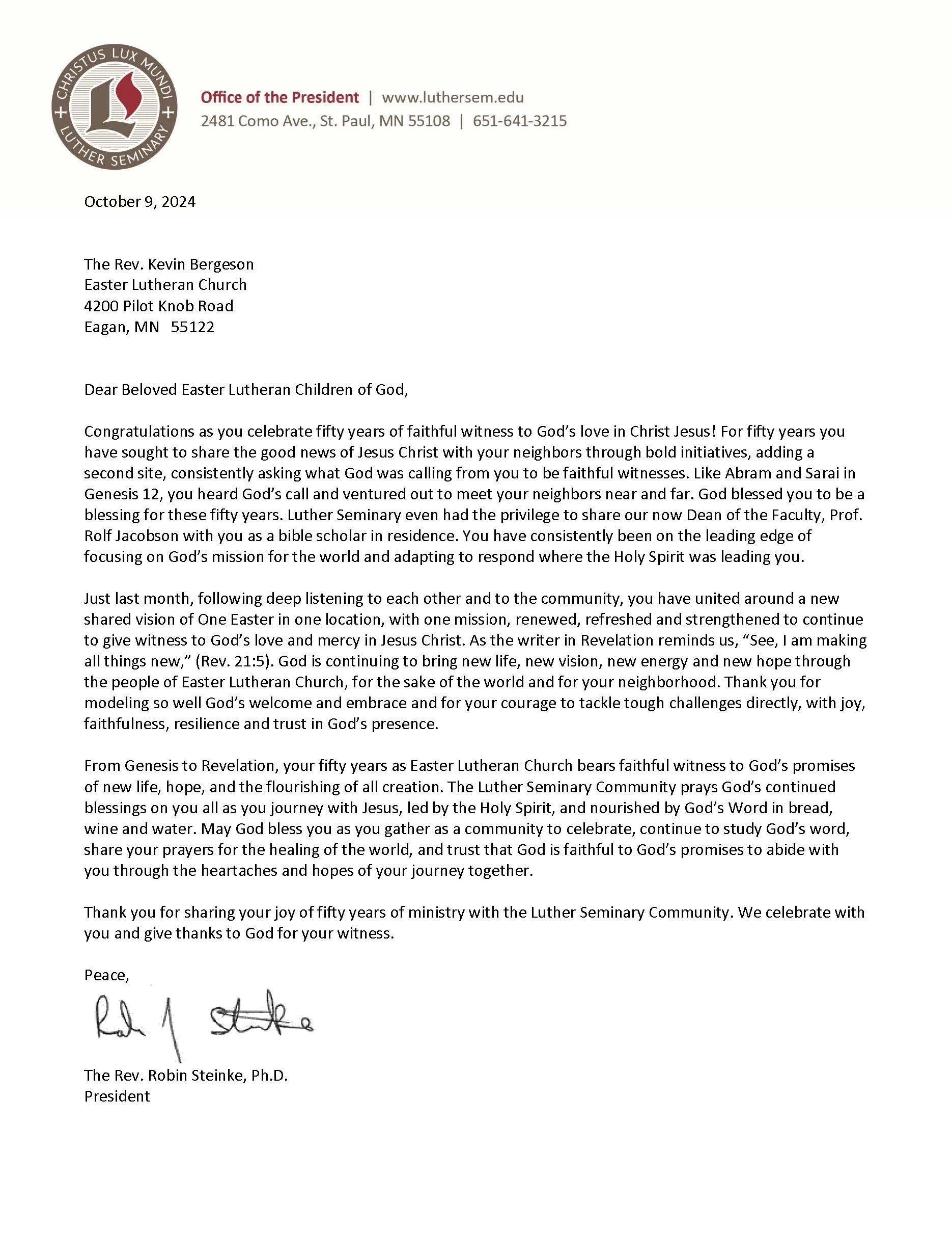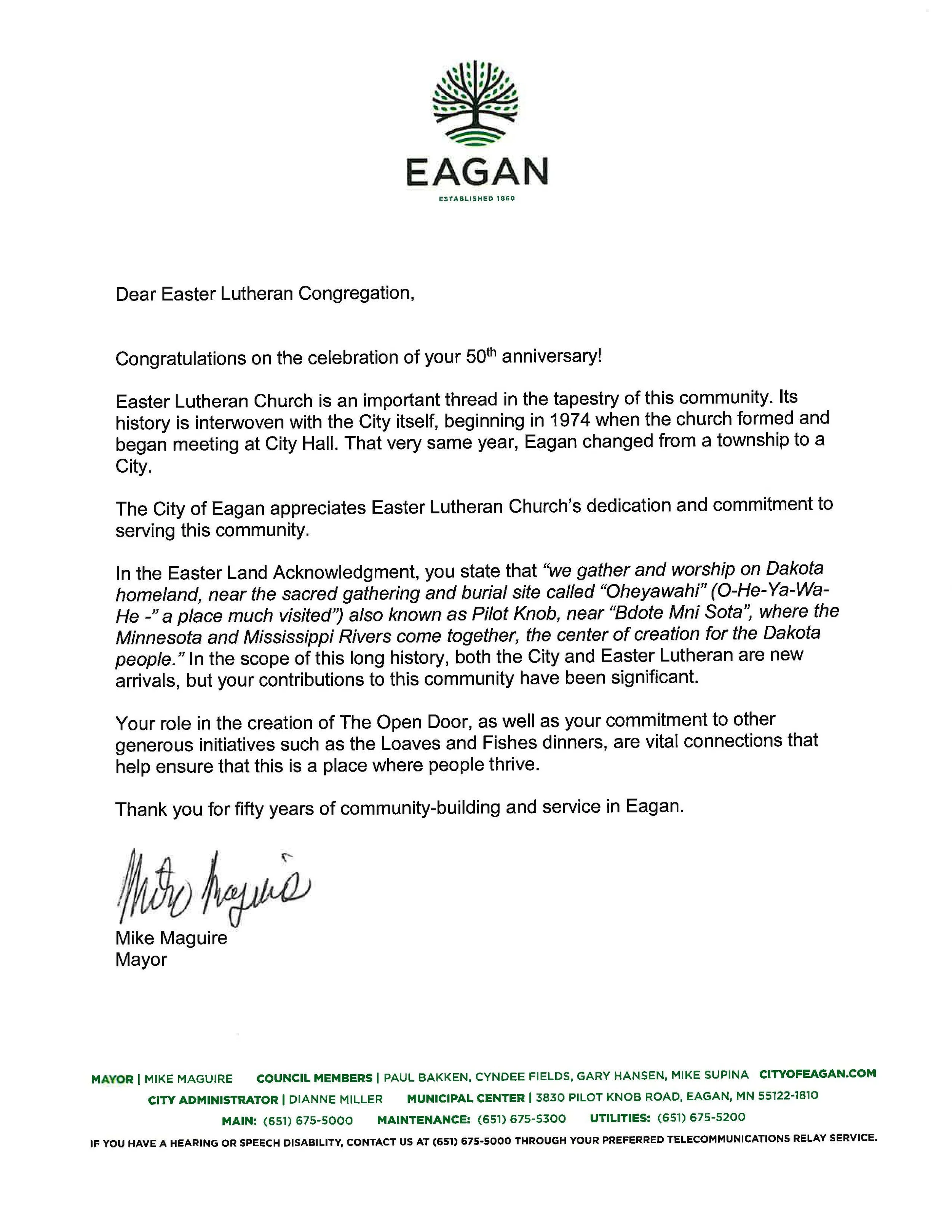 In 1974, forty-three families joined together and officially organized as Easter Lutheran Church. The church was originally housed at City Hall before moving up the street to our current Easter on the Hill campus in 1977. To meet the needs of our growing community, we opened the Easter by the Lake campus in 2001 located one mile south of the Hill. Easter has always been a church with a heart for all of God’s people. In 2009, Easter and two other Eagan churches founded The Open Door, formerly The Eagan Resource Center, to meet the community’s need for a food shelf. With building modifications in 2014, we expanded our outreach ministries to include Homework Help, TreeHouse, and the Loaves & Fishes Community Meal.